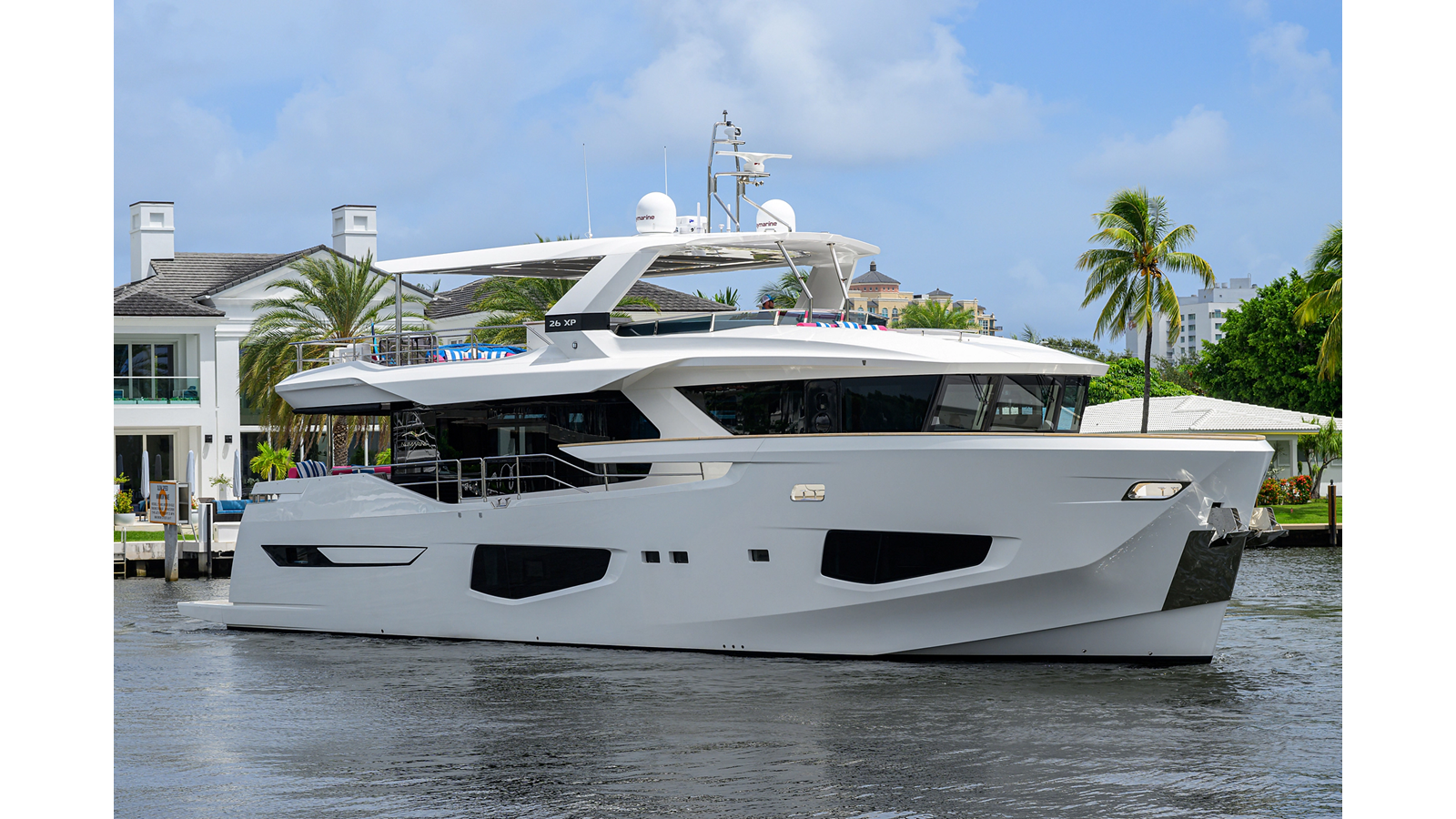 C3, the 2023 Numarine 26XP was specifically built for the American market and features upgraded MAN 1800hp engines giving her a top speed of 31 knots with a cruise speed of 23 knots. At economical speeds she has an impressive range of 1,200nm. The 26XP is a large volume 85' motor yacht that features floor to ceiling windows in the main salon, large galley with plenty of storage and refrigeration, spacious wheelhouse with sitting area and forward raked windows for great visibility. The aft deck has a large dining table, massive amount of storage and stairs theat lead up to the sundeck complete with second helm station, dining & lounge area with custom deck furniture, bar area, and extended hard top.