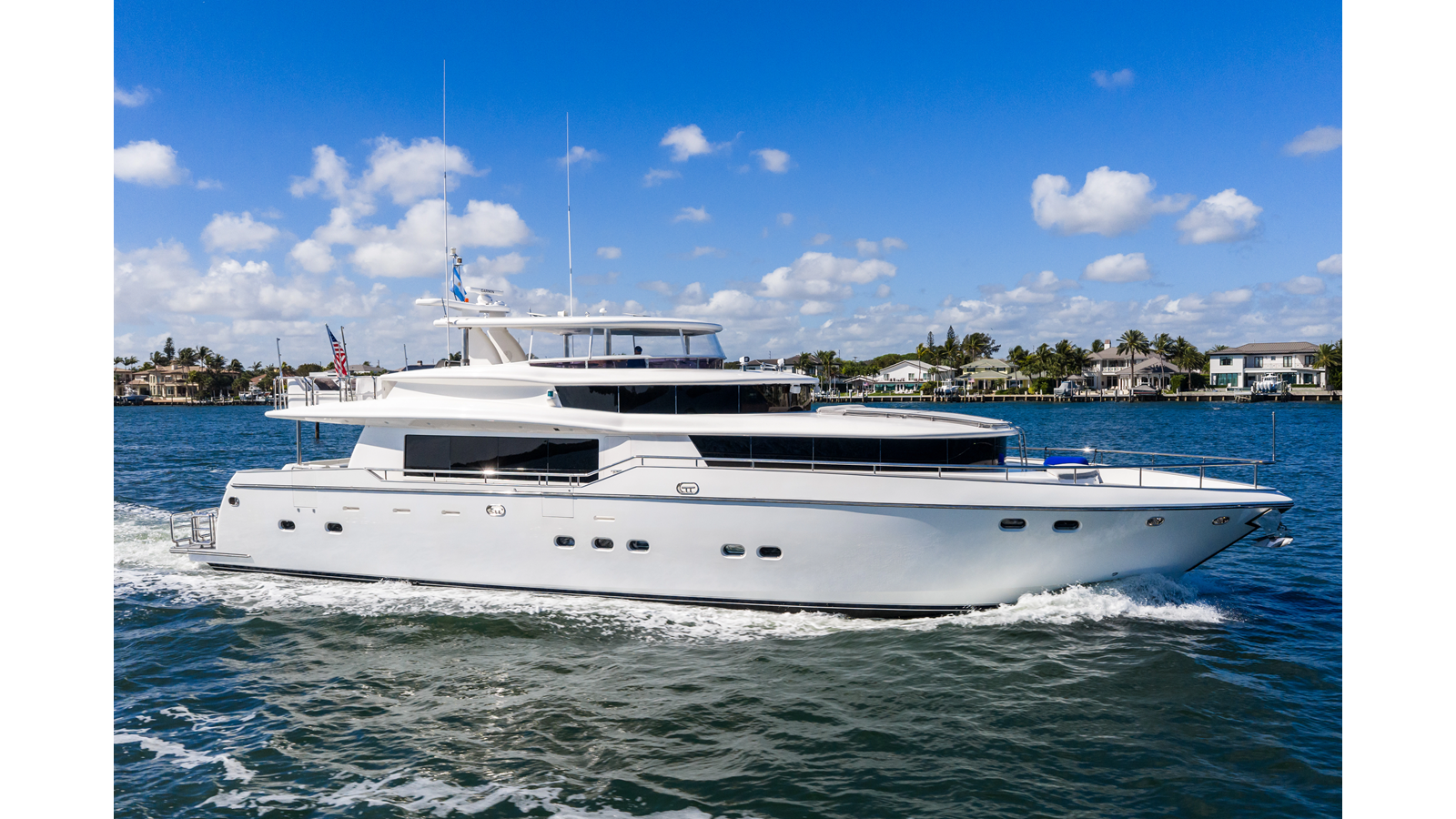 The unmistakable lines of the Bill Dixon design, with upper and lower vertical windows, make her profile iconic. This same yacht is still being built today, now marketed as a 93 with an extended platform.